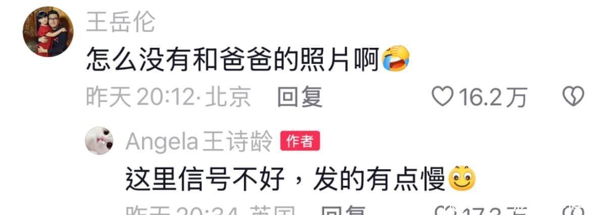 没想到爸爸王岳伦也留言,表示为什么没有和爸爸的合影呢? 只见王诗龄十分高情商回应,表示网速太慢,还没发。